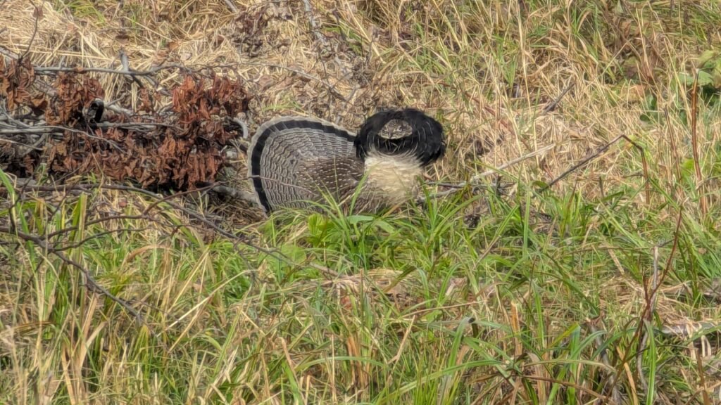 One advantage of waking so early is being able to quietly observe the forest waking up too. It’s now an almost daily occurrence to see grouse pecking around in the leaves and branches on the ground. They are not graceful birds, and certainly in our experience quite stupid, but watching them scavenging for food is somewhat calming. A few days ago, a male was proudly strutting with his feather all fanned out to attract a female, who seemed very disinterested in his advances.